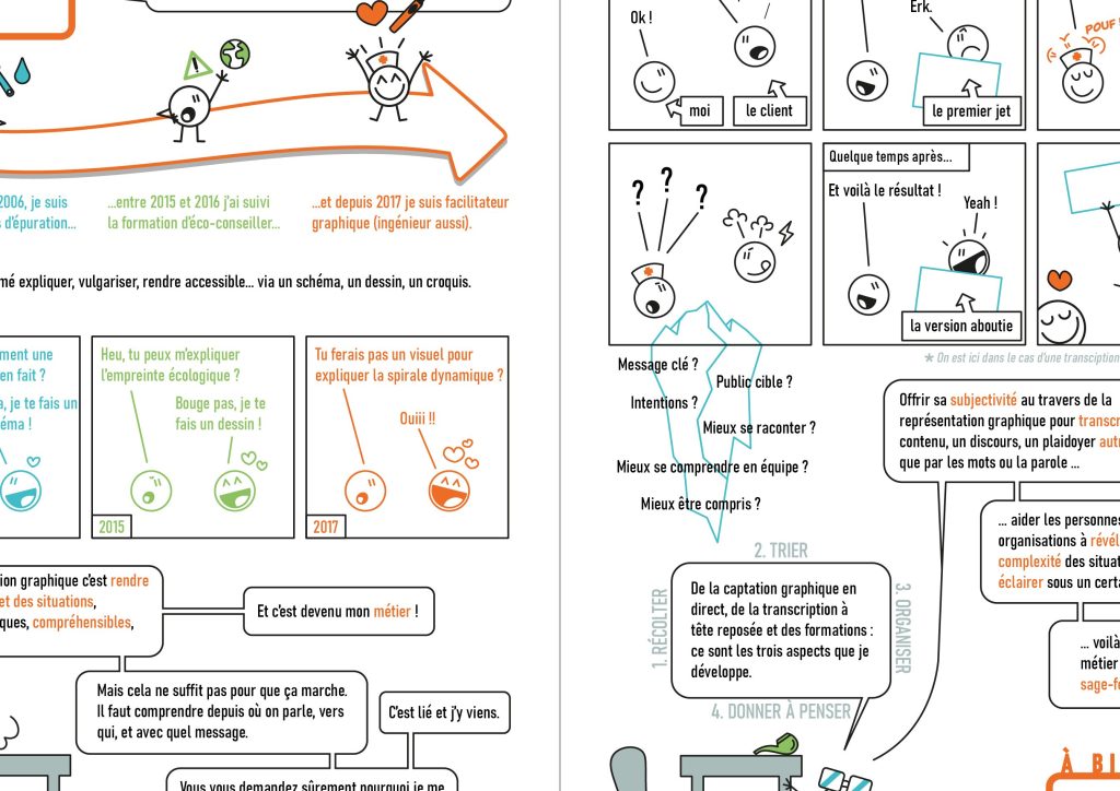 En 2016 je commence à renforcer mes compétences graphiques lors de la formation d’éco-conseiller et deviens, grâce à des sacrés coups de pouces, facilitateur graphique en 2017. Cela me permet de continuer à évoluer dans un volet qui me tient particulièrement à cœur : rendre visible et intelligible la connaissance et le savoir, même aux non-initiés, au travers de visuels clairs et chaleureux.