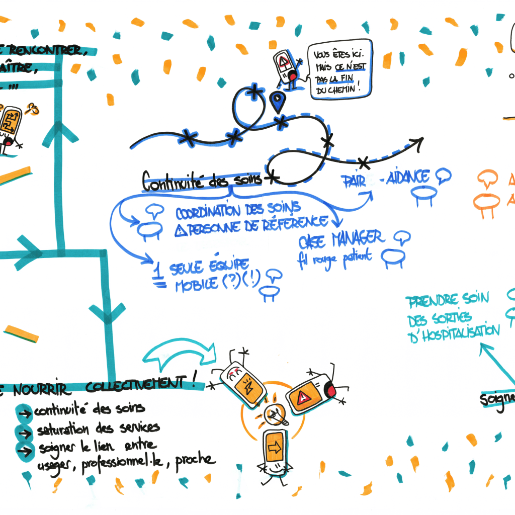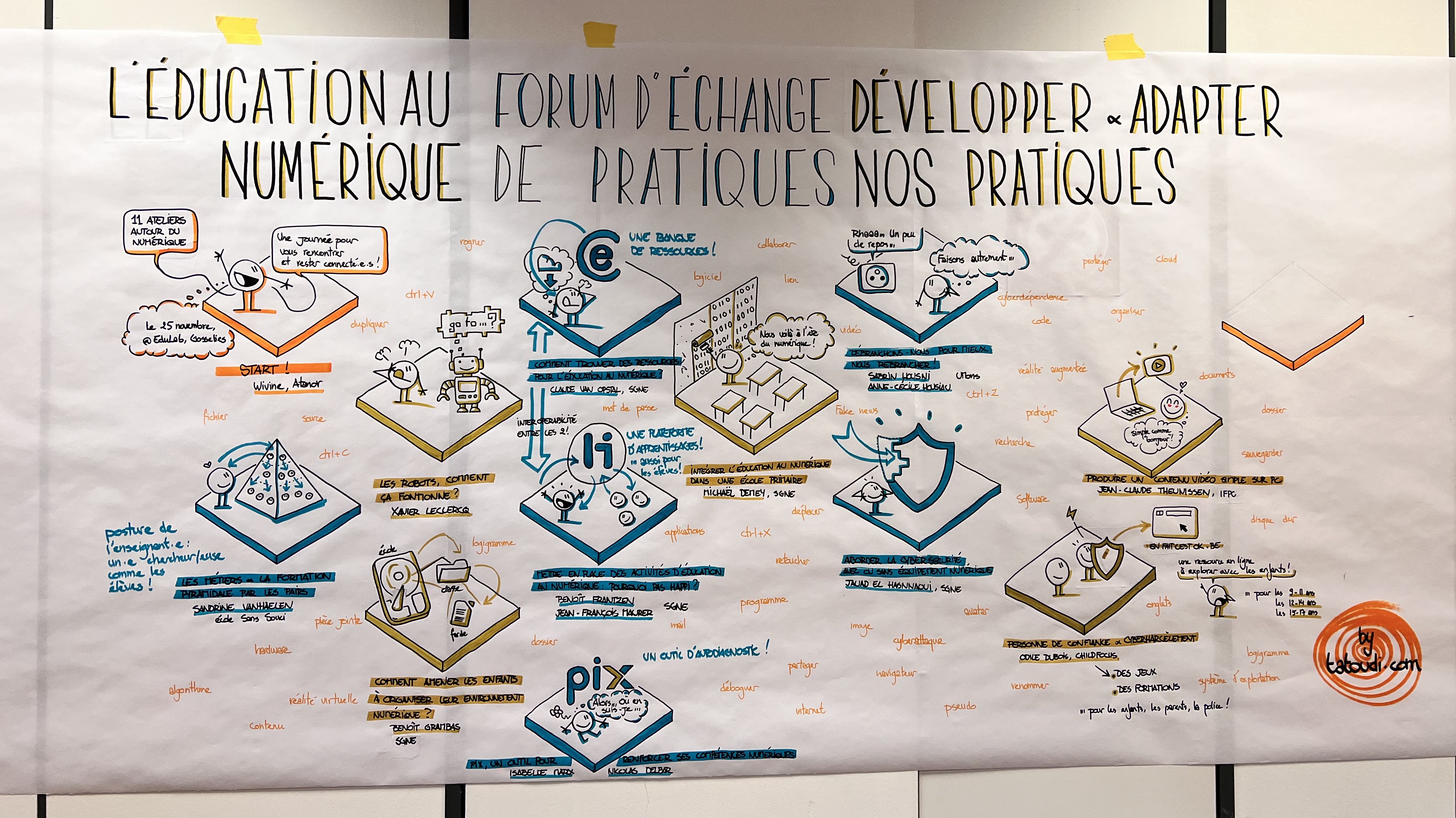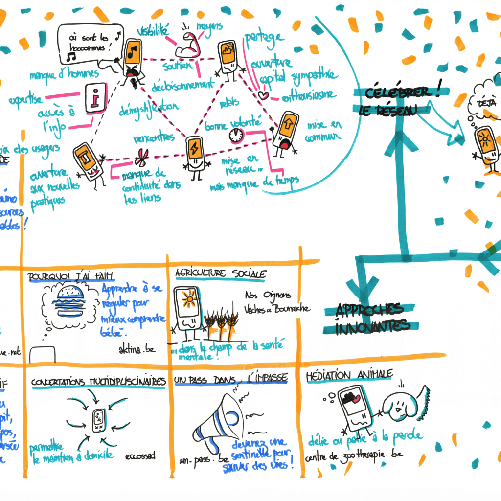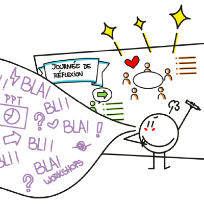Un reportage graphique est le résultat d’une écoute active et de tous les instants de ce qui se dit et se vit, pendant un temps donné, par l’assemblée présente. Ce résultat est un (savant) mélange de mots, de pictogrammes, de couleurs et de forme, et est, finalement, un compte-rendu graphique et subjectif de ce qui s’est dit et vécu.